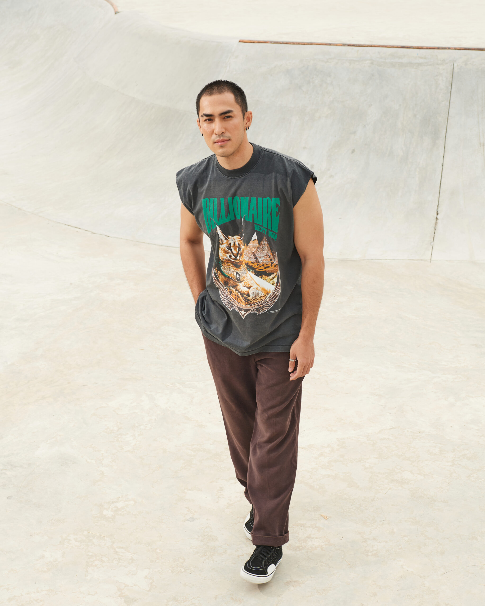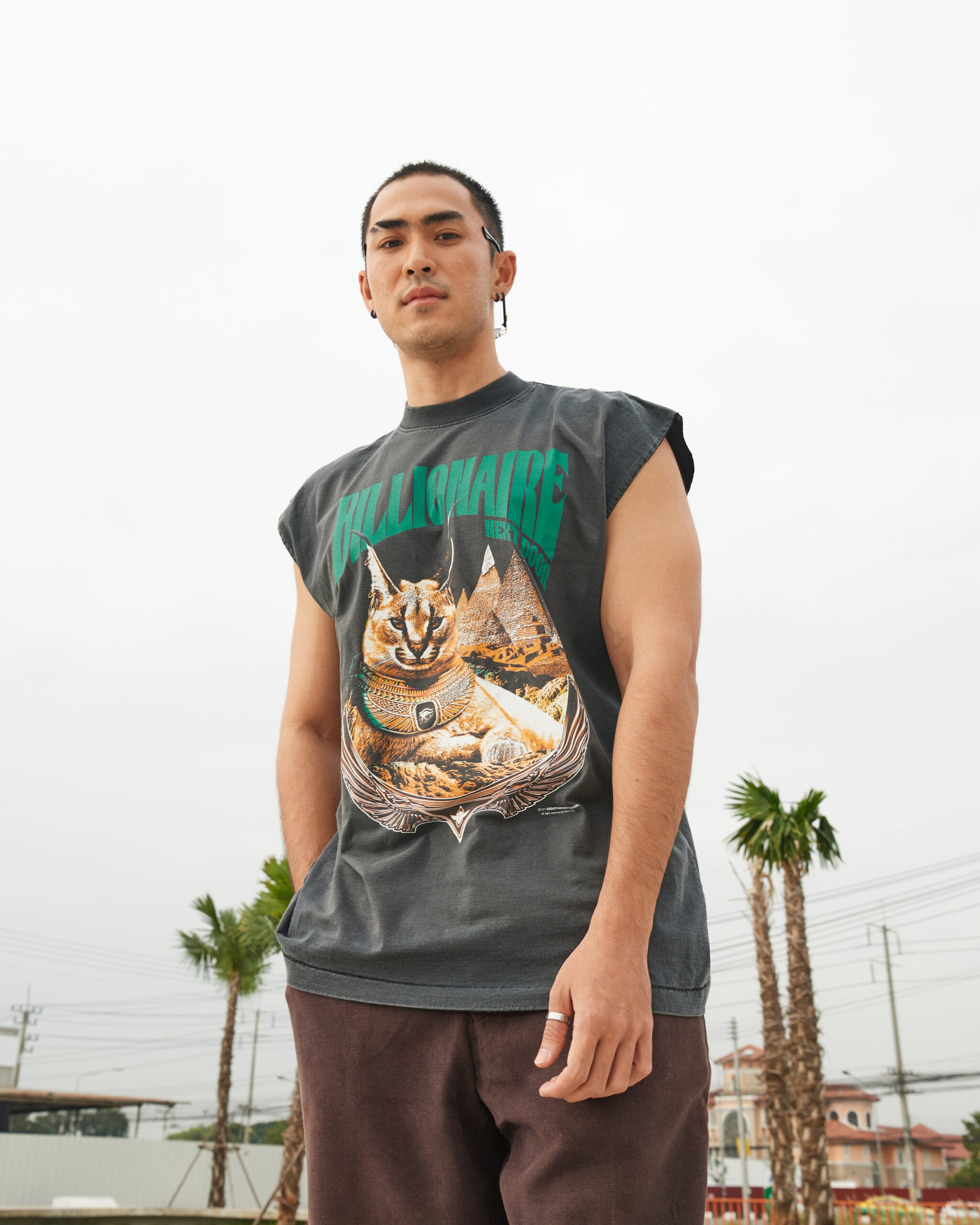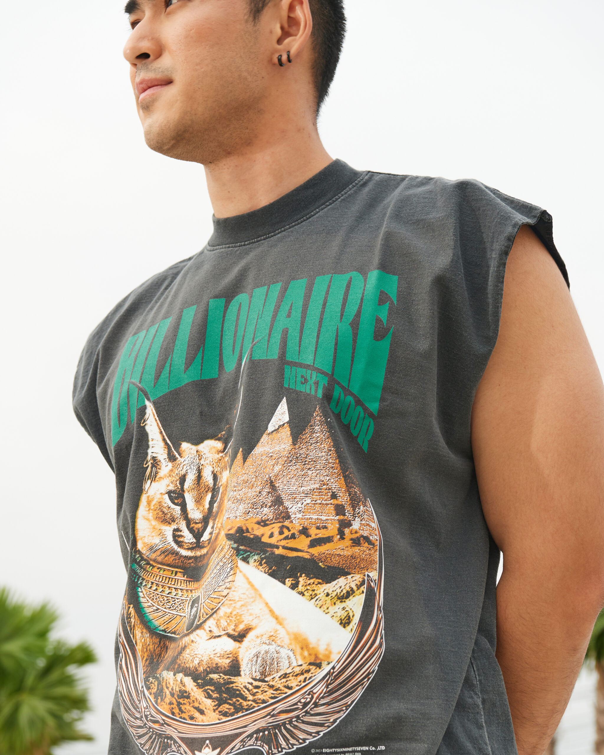 Design: A majestic Caracal cat adorned with Egyptian-inspired jewelry sits confidently against a backdrop of pyramids. The bold text “BILLIONAIRE NEXT DOOR” adds a modern twist, blending ancient luxury with contemporary elegance.
